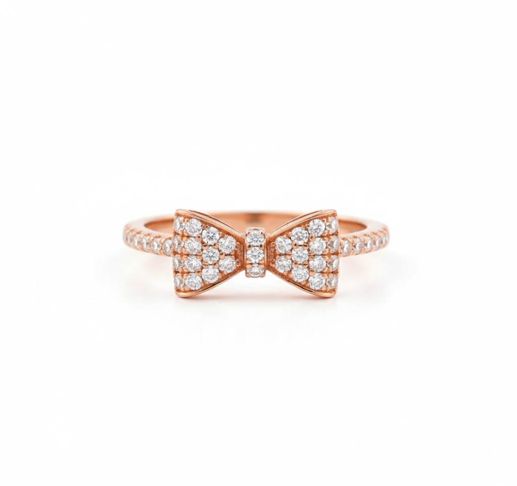 可憐なリボンモチーフにダイヤモンドを贅沢に敷き詰めたフェミニンなリング。センターの立体感あるフォルムとアーム部分のメレダイヤが、どの角度から見ても華やかに輝きます。K18ローズゴールドの優しい色合いが肌になじみ、上品で愛らしい印象に。繊細ながらも存在感があり、フォーマルにもカジュアルにも合わせやすいデザインです。大切な方へのギフトにもおすすめのジュエリーです。