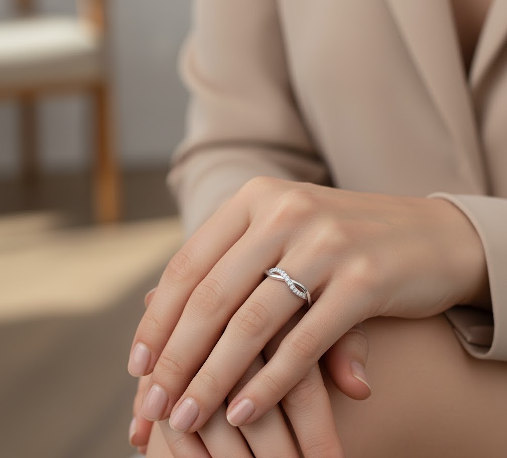 柔らかなツイストラインにメレダイヤをあしらった、エレガントで繊細なプラチナリング。ダイヤモンドが光を受けて上品に輝き、指先を美しく引き立てます。流れるようなラインが女性らしさを際立たせ、シンプルながら洗練された印象に。Pt950の深みある輝きと耐久性は、永く愛用できる品質の証。結婚指輪や記念日のギフトにも最適な、タイムレスなデザインです。