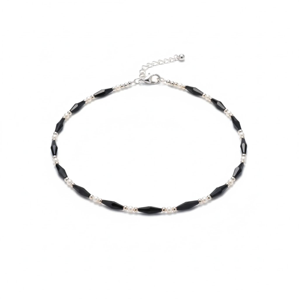 艶やかなブラックオニキスとミニパールを交互に配した、洗練された印象のK18ホワイトゴールドネックレス。シャープなカットを施したオニキスが光を反射し、パールの柔らかい輝きと美しいコントラストを生み出します。軽やかな印象ながら存在感があり、フォーマルにもモードにも映えるデザイン。