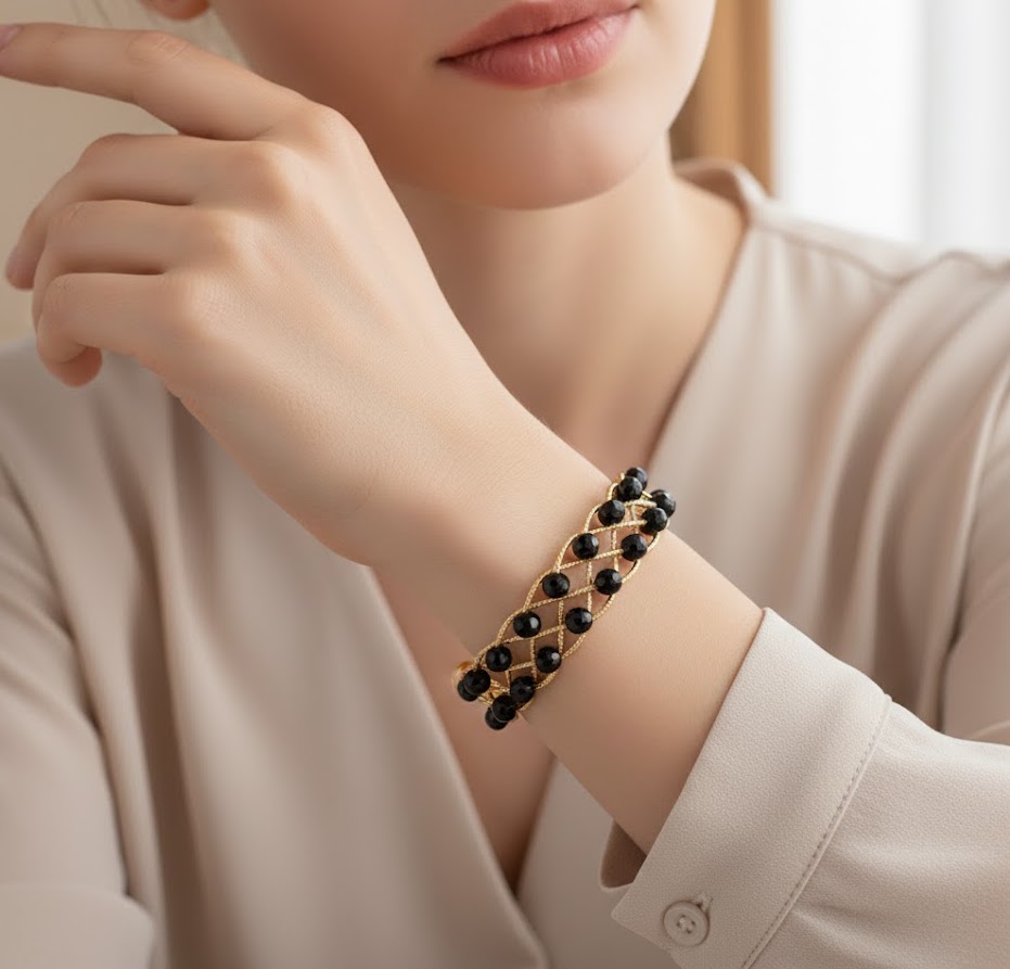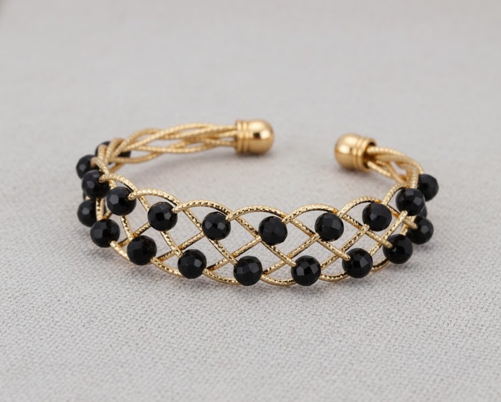 ブラックオニキスとK18ゴールドを組み合わせたラグジュアリーブレスレット。メッシュ編みが光を纏うように輝きます。
