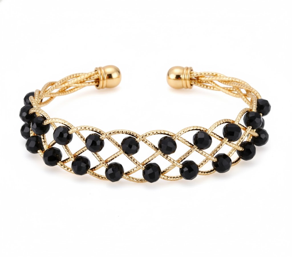 精緻なメッシュ編みのK18ゴールドワイヤーに、カットオニキスをリズミカルに配したバングルブレスレット。立体的な編み込みデザインが光を受けて繊細に輝き、上品かつ力強い印象を与えます。オニキスの深い黒がゴールドの華やかさを引き締め、ユニセックスで楽しめるデザイン。開口部があり着脱もスムーズで、手元に確かな存在感を添えます。