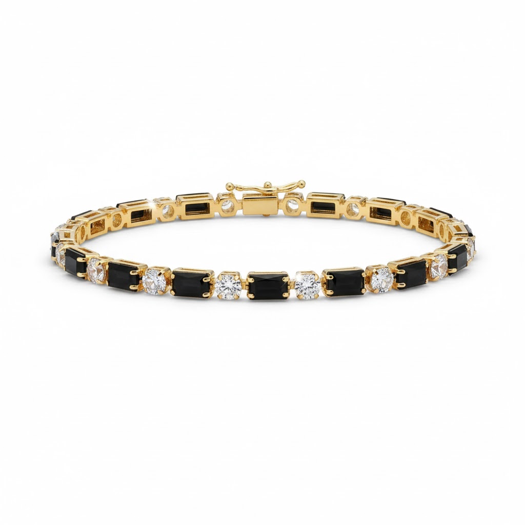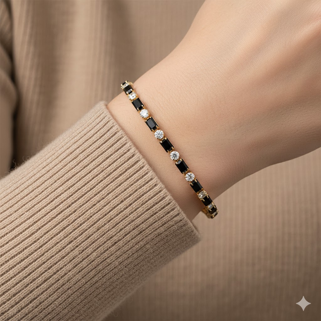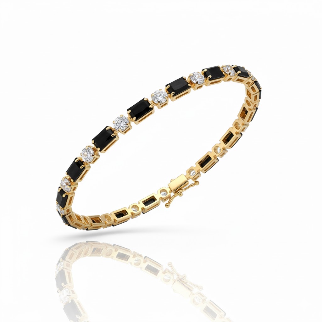 ブラックダイヤモンドとホワイトダイヤモンドを交互に配した、K18イエローゴールドのテニスブレスレット。シンプルな構成ながら、色のコントラストが生むモダンな輝きが魅力。熟練の技でセッティングされたダイヤが手首の動きに合わせて繊細に輝きます。